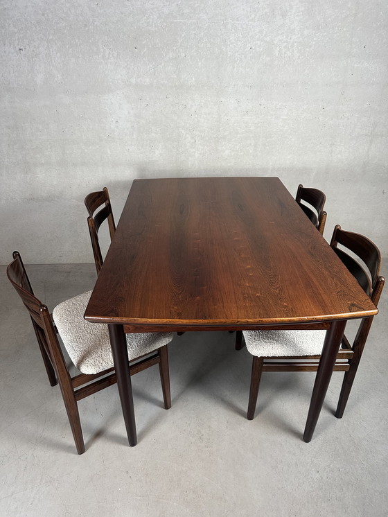 Bellissimo set da pranzo in palissandro di metà secolo. 1 tavolo da pranzo regolabile e 4 sedie. Design scandinavo (Boltinge). In ottime condizioni. Seduta nuova, realizzata professionalmente con tappezzeria di alta qualità. Notare i dettagli di finitura del tavolo. Il lato corto è leggermente curvo, il che gli conferisce un aspetto più moderno rispetto a un tavolo rettangolare standard. Altezza del tavolo: 74,5 cm. Larghezza del tavolo: 140 cm / 192 cm / 244 cm. Profondità del tavolo: 90 cm. Le sedie hanno un'altezza di: 77 cm, schienale incluso. Larghezza: 50 cm. Profondità: 50 cm. Altezza della seduta: 45 cm. Ogni sedia pesa 6 kg. A parte qualche piccolo graffio superficiale, questo è un set ben tenuto! Senza segni. Altre foto disponibili su richiesta.