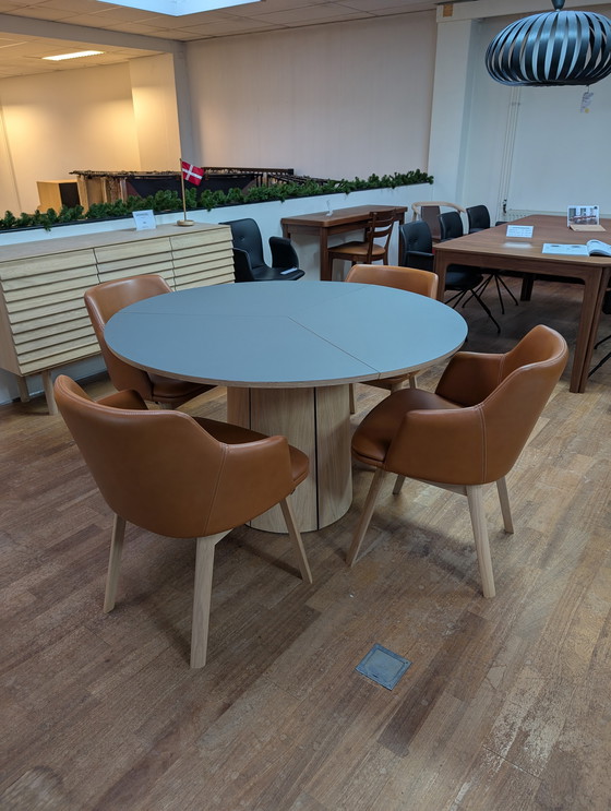 Questo tavolo da pranzo rotondo Skovby 33 può ospitare da quattro a nove persone. Grazie a un esclusivo sistema di chiusura, questo tavolo da pranzo può essere esteso fino a nove persone. Le prolunghe sono riposte nella base, consentendo di espandere rapidamente questo tavolo da pranzo. Una volta aperto, il tavolo mantiene il suo carattere rotondo. Il vantaggio di un tavolo da pranzo rotondo è che tutti si siedono vicino al centro. Ideale per cenare o giocare a carte o giochi da tavolo. La base del tavolo è zavorrata per una maggiore stabilità e i piedini regolabili sulla base assicurano che rimanga sempre in piano. Questo è un set da esposizione che è stato utilizzato per un periodo nel nostro showroom. Il tavolo e le sedie sono nuovi e integri. Questo mobile è dotato della garanzia completa che riceveresti su un modello nuovo. **Tavolo** Materiale: Rovere oliato bianco con piano in HPL nano verde (Fenix) Dimensioni: 123 diametro chiuso - 149 diametro aperto - 74 altezza **4 sedie** Materiale: Rovere oliato bianco con rivestimento in pelle cognac
