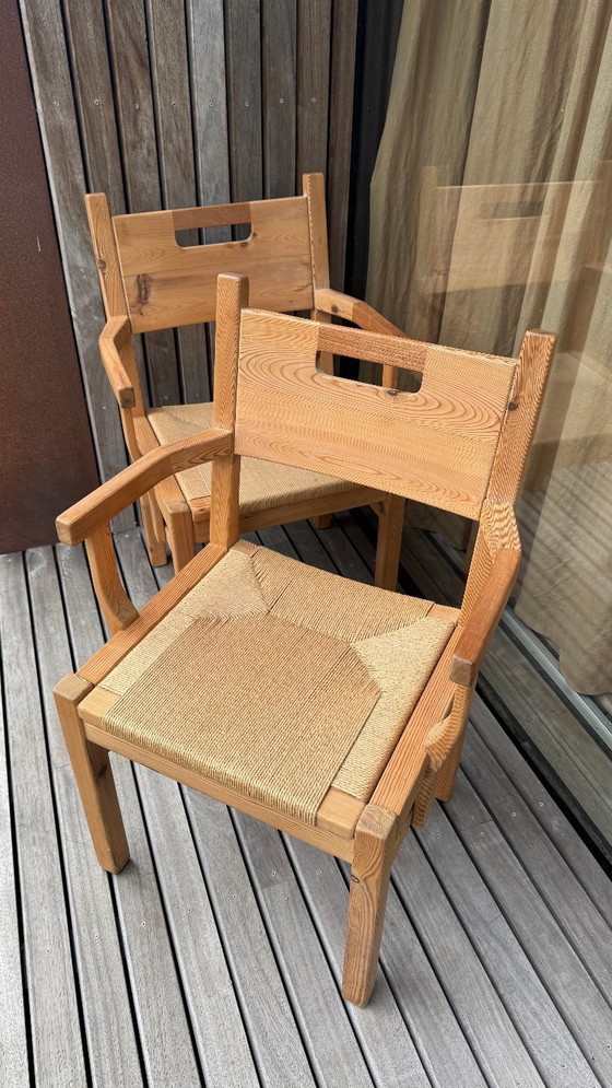 Elementi in pino massello/legno duro e sedute in canna intrecciata.