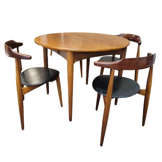 Raffinato set da pranzo con tavolo rotondo allungabile e quattro sedie in teak, che riprende fedelmente il design del set "Roundette" di Hans Olsen per Frem Røjle, icona del design scandinavo moderno di metà secolo.