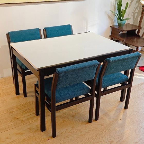 Questo splendido set da pranzo Pastoe è ancora in buone condizioni vintage. Il tavolo presenta qualche segno di usura lungo i bordi. Il piano bianco è ancora in ottime condizioni. Anche le strutture delle sedie presentano qualche segno di usura, ma per il resto sono in ottime condizioni. Il bellissimo tessuto blu rende le sedie molto eleganti. Un set splendido per qualsiasi casa!