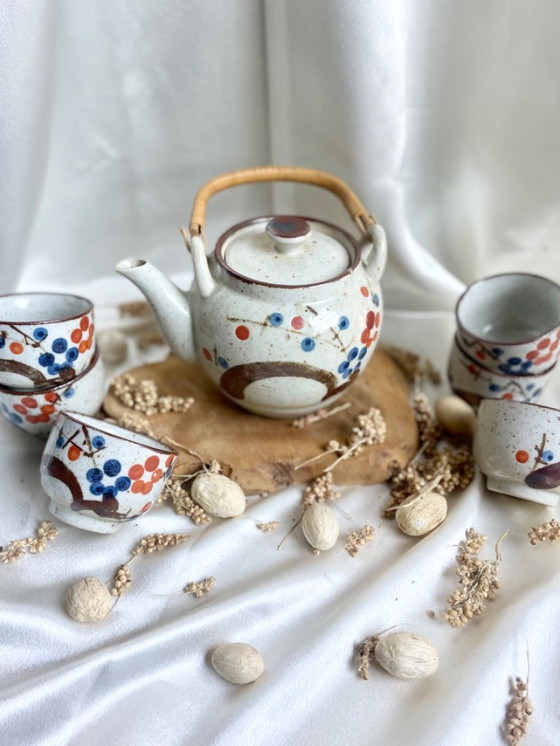 Immergiti nell'eleganza dell'artigianato giapponese di metà secolo con questo squisito set da tè vintage. Caratterizzato da un design in stile Kutani splendidamente dipinto a mano, questo set include una teiera e sei tazze abbinate, ciascuna decorata con vivaci tonalità di blu e rosso su uno sfondo di ceramica bianca. - La teiera è completata da un robusto manico in rattan, che aggiunge un tocco di fascino rustico e praticità. - Ogni pezzo è meticolosamente realizzato in ceramica di alta qualità, garantendo resistenza e un'estetica senza tempo. - Gli intricati motivi dipinti a mano riflettono il ricco patrimonio culturale e la tradizione artistica del Giappone. Questo set da tè non è solo funzionale, ma un pezzo unico che arricchirà qualsiasi esperienza culinaria. Immaginalo mentre adorna la tua tavola, invitando all'ammirazione e stimolando la conversazione. Acquista questo straordinario set e porta un pezzo di arte giapponese nella tua casa.
