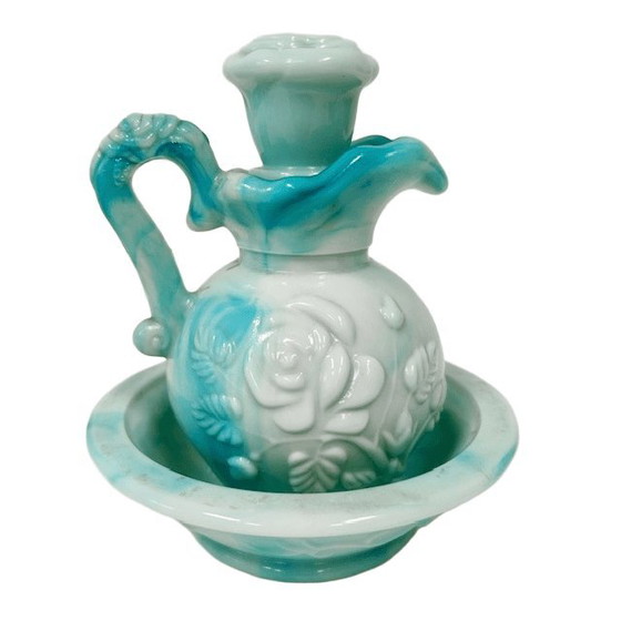 Set da toeletta vintage Avon con brocca e ciotola in vetro opalino blu-verde, anni '70