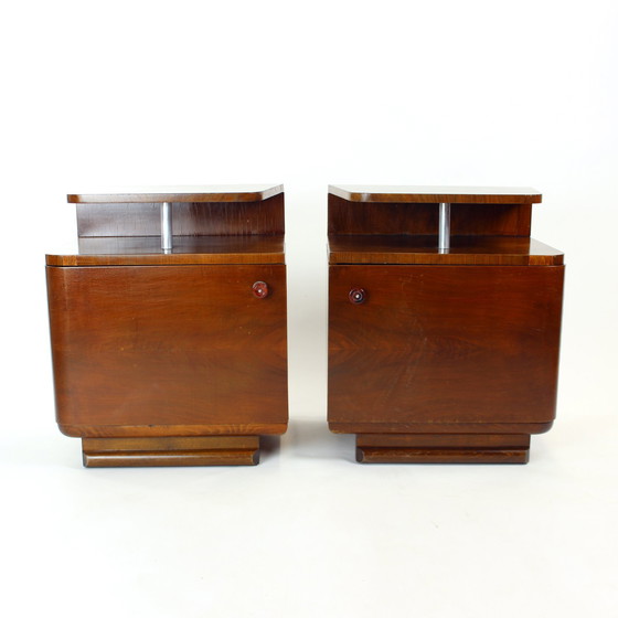 Bellissimo set di due comodini completamente restaurato. Furono prodotti in Cecoslovacchia negli anni '50. I comodini sono realizzati in legno con impiallacciatura in rovere scuro. Il design è molto interessante: ogni comodino ha un vano con ante semplici su cerniere a libro. Le maniglie sono le maniglie originali in resina e acciaio. Il piano superiore è sorretto da una bella asta metallica. Questo aggiunge un tocco di stile al pezzo. I comodini sono stati completamente restaurati. Alcune impiallacciature hanno dovuto essere corrette e sostituite. Bellissimo set, pronto per essere utilizzato. Condizioni: Restaurato.
