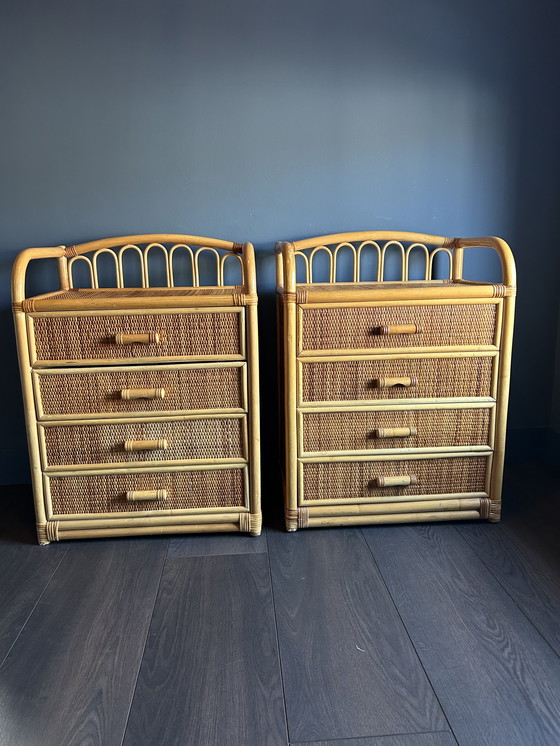 Bellissimo set di 2 cassettiere/comodini in rattan in un caldo colore naturale. Questi mobili hanno un delizioso look vintage boho e si adattano perfettamente a una camera da letto, un corridoio o un soggiorno.