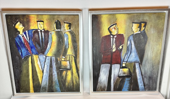 Serie decorativa di due dipinti moderni in stile angolare di ispirazione cubista. Le opere mostrano uomini d'affari stilizzati con valigette, eseguite in acrilico/olio su tela. L'uso del colore (ocra, rosso, blu, nero, bianco) e il bagliore della luce conferiscono ai dipinti un aspetto potente.