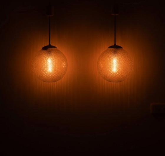 Set di 2 lampade a sospensione identiche in vetro di metà secolo, Polonia anni '60