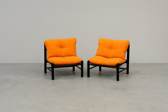 Una raffinata coppia di poltrone italiane, attribuite a Carlo Santi per Arflex, modello Carmina, progettate intorno al 1976 e documentate su Domus n. 561 (agosto 1976).
