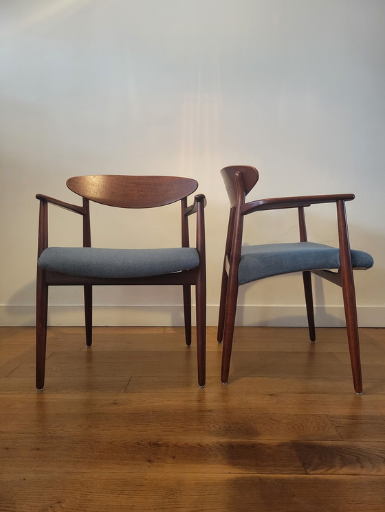 Un set di due poltrone danesi in teak massello, disegnate da Ejnar Larsen e Aksel Bender Larsen e prodotte da Naestved Møbelfabrik negli anni '50. Le sedie presentano una struttura in teak sorprendentemente leggera e slanciata. Lo schienale curvo ed ellittico sembra fluttuare sopra la seduta, rendendolo un pezzo di rara bellezza. Queste rare sedie emanano eleganza e offrono un comfort di seduta eccellente. Il set è in ottime condizioni. Dimensioni: altezza 78 cm, larghezza 61 cm e profondità 64 cm.