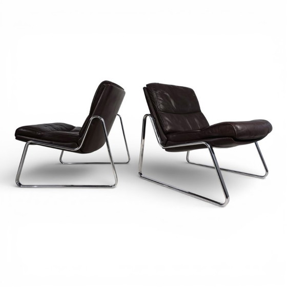 Coppia di poltrone Drabert con rivestimento in pelle color tabacco, scocche marroni e un'elegante patina. Le scocche e la pelle dei cuscini di seduta e schienale sono in buone condizioni, con patina sui cuscini di seduta. La struttura curva cromata è impeccabile su entrambe le poltrone. Le linee dinamiche rendono queste poltrone un elemento d'arredo senza tempo.