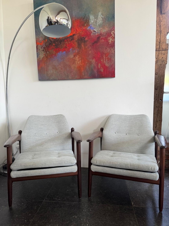 Queste poltrone presentano il caratteristico design di metà secolo, con una solida struttura in teak ed eleganti braccioli dalle forme organiche.