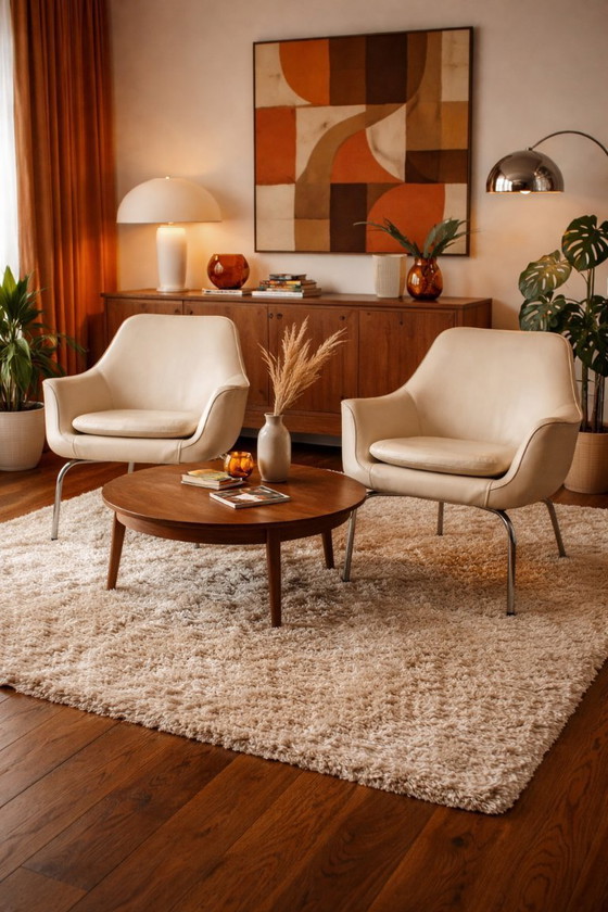 Il rivestimento presenta lievi e normali segni di usura dovuti al tempo, senza segni di usura eccessivi. La struttura è stabile e le poltrone sono comode. Ideali per un soggiorno, un angolo lettura, un ufficio, uno studio, un locale di accoglienza o un elegante interno vintage.