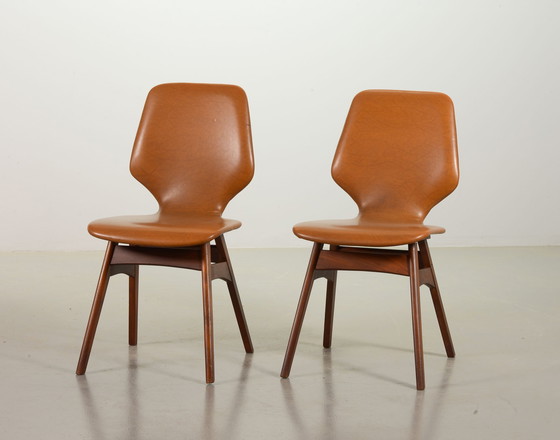 Set di due sedie da pranzo di design olandese. Realizzate nello stile di Webe. Struttura in legno di teak con rivestimento in similpelle color cammello. Anni '60. In ottime condizioni vintage, con qualche segno di usura coerente con l'età e l'uso.