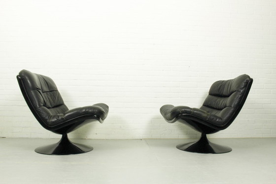 Questo set di 2 sedie da salotto F976 di metà secolo è stato progettato da Geoffrey Harcourt e prodotto per Artifort nei Paesi Bassi nel 1968. Le sedie hanno una base in metallo e una scocca in plastica, con rivestimento originale in pelle nera. La pelle presenta diversi strappi che sono stati riparati, come chiaramente visibile nelle fotografie.
