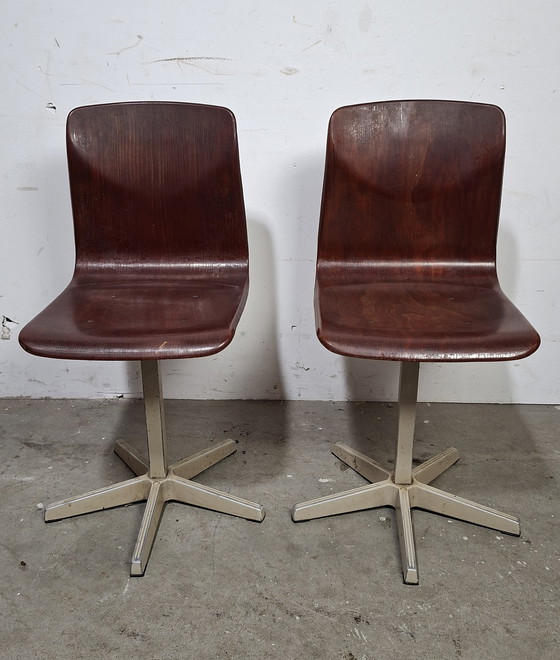Questo set di due sedie vintage per bambini Galvanitas degli anni '60 offre un affascinante scorcio sul passato. Con il loro design iconico e la struttura robusta, queste sedie sono un'aggiunta perfetta a qualsiasi ambiente che desideri un tocco di stile retrò. La seduta e lo schienale in legno sono accuratamente sagomati per il comfort, mentre la base in metallo garantisce stabilità e durata.