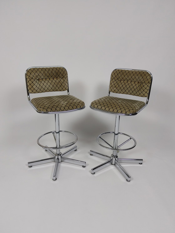Aggiungete un tocco di fascino retrò ai vostri interni con questo bellissimo set di due sgabelli da bar vintage degli anni Settanta. Le sedie hanno un'elegante struttura cromata, una comoda seduta e uno schienale rivestiti con un caratteristico tessuto a nido d'ape. Ideali per il bar, l'isola della cucina o il tavolo alto.