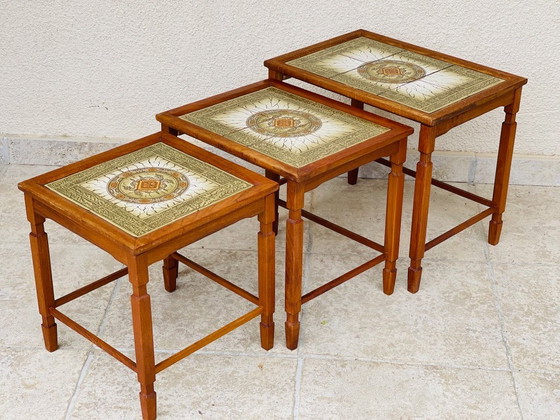 Set di 3 tavolini da caffè impilabili in teak e ceramica, Danimarca, 1960