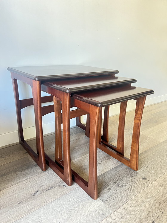 Si tratta di un set di tre tavolini impilabili vintage (chiamati anche tavolini sats) risalenti alla metà del XX secolo. I tavolini presentano un design distintivo, spesso attribuito ai produttori britannici G-Plan o Sunelm.
