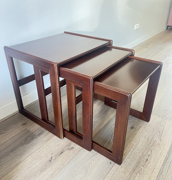 Questo set di tre tavolini impilabili (chiamati anche mimiset) è un pezzo vintage in stile Mid-Century Modern. I tavolini sono realizzati in teak e risalgono agli anni '60 o '70.