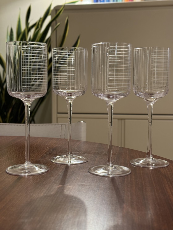 Un set di quattro eleganti bicchieri da vino House Doctor, realizzati in vetro trasparente con linee orizzontali e verticali delicatamente incise. Le linee grafiche conferiscono a questi bicchieri un aspetto sobrio ma distintivo e si adattano perfettamente a tavole dallo stile scandinavo, minimalista e moderno.