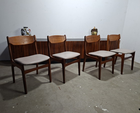 Questo set di quattro sedie Erik Buch, meticolosamente restaurato, offre un'eleganza senza tempo, perfetta per una sala da pranzo sofisticata. La combinazione di legno caldo e morbida pelle crea un'atmosfera invitante che trasuda comfort e stile.