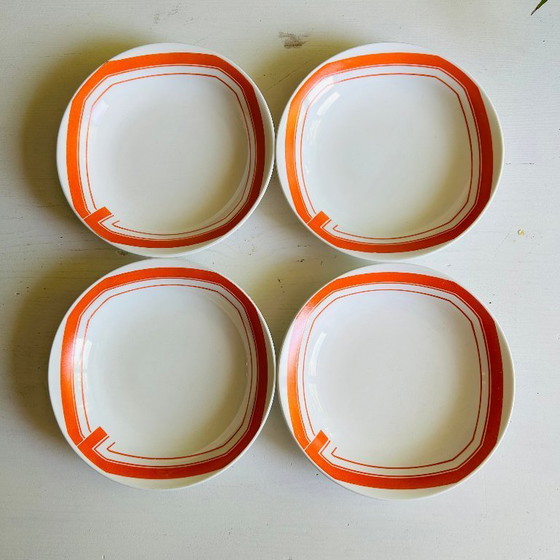 Set di quattro piatti Rivanel, Francia, circa 1970. I piatti fondi hanno una forma angolare e sono decorati con un bordo arancione, un design tipico degli anni '70! Questi piatti sono realizzati in vetro resistente al calore, lavabile in lavastoviglie e resistente ai danni. Marchiati "Décor Inalterable" (decorazione indelebile), Rivanel Francia.