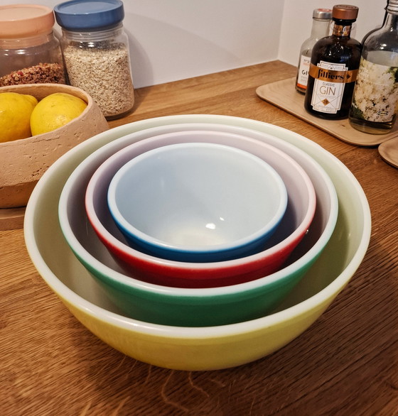 Il primissimo set di ciotole Pyrex fece il suo debutto negli anni '40. Si trattava di un set di quattro ciotole impilabili di varie dimensioni, nei colori primari giallo, rosso, verde e blu. Un set da cucina popolare e colorato, rimasto un classico per i successivi trent'anni, prodotto ininterrottamente decennio dopo decennio. Queste ciotole appartengono al design originale con colori primari, ma sono state realizzate negli anni '50.