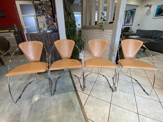 Set di 4 poltrone Linda di Arrben, pelle color cammello, struttura in acciaio cromato, vintage anni '80