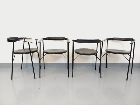 Set di 4 poltrone vintage di design italiano in metallo nero e similpelle nera degli anni '80