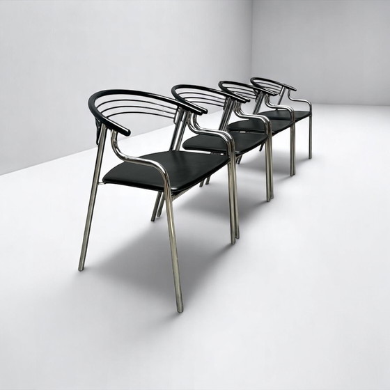 Queste quattro sedie eccezionali affascinano con il loro fascino futuristico. Il design elegante e minimalista è elegantemente sottolineato da telai cromati con dettagli neri. Le sedute sono realizzate in similpelle di alta qualità e sono in ottime condizioni. Queste sedie non sono solo un elemento di spicco, ma anche estremamente stabili e di alta qualità. La loro struttura minimalista le rende leggere e facili da spostare, ideali per spazi abitativi o lavorativi moderni. Minimi segni di usura e un po' di ruggine sono presenti sui telai, sottolineandone ulteriormente il carattere industriale. Un pezzo di design per gli amanti delle linee pulite e dell'estetica futuristica!