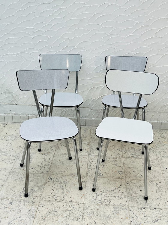 Set di 4 sedie da cucina vintage in Formica grigio cromato.