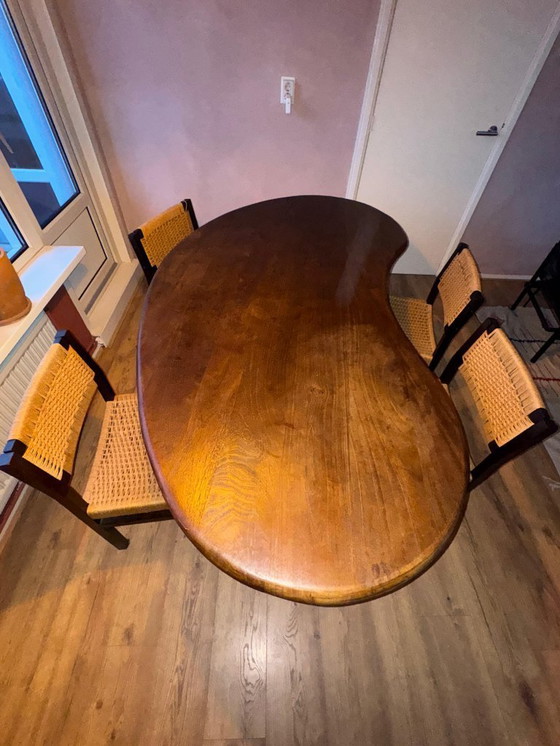 Splendido set da pranzo vintage in wengé. Progettato da Arnold Merckx per Fristho Franeker nel 1973. La struttura è in legno massello di wengé e la seduta è in corda di carta.