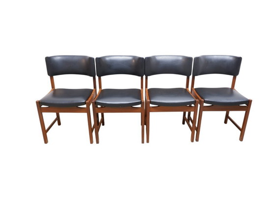 Set di 4 sedie da pranzo con struttura in legno di teak e rivestimento in skai nero.