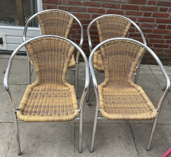 CondizioneBuonoColoriBeige, ArgentoMaterialeAlluminio, RattanNumero di articoli4Altezza72 cmLarghezza54 cmProfondità54 cmSegni di utilizzoGraffi