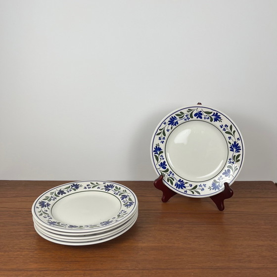 Set di 6 piatti da dessert Churchill England, motivo floreale, 1970, ceramica, colore blu e verde. Dimensioni: diametro: 20,5 cm, altezza: 2 cm. Disponibili 2 lotti. Buone condizioni generali, articoli vintage, conservano tracce del tempo e della lavorazione (vedi foto).