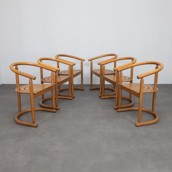 Un set di sei sedie da pranzo in legno curvato, scultoree e splendidamente equilibrate, realizzate dal rinomato produttore tedesco Allmilmö negli anni '80. L'elegante schienale curvo, la struttura fluida e continua e la raffinata falegnameria conferiscono a queste sedie un morbido ritmo architettonico, una perfetta fusione di artigianalità e design funzionale.