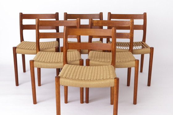 Set di 6 sedie da pranzo in teak Niels Otto Moller, modello 84, 1976 – Sedili in corda rinnovati, marchio del produttore, spediz