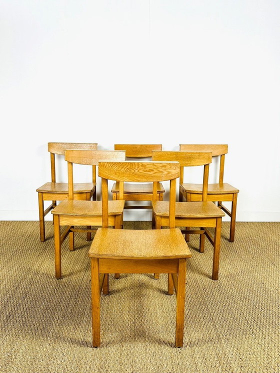 Un magnifico set di sei sedie in rovere massello dal design semplice e funzionale tipico degli anni '50 e '60.