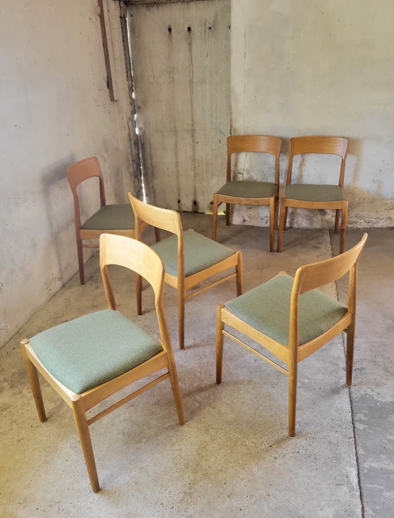 Set vintage di sei sedie disegnate da Henning Kjearnulf per Korup Stolenfabrik in Danimarca. Le sedie hanno una sottile struttura in rovere con gambe affusolate. Un dettaglio raffinato è il modo in cui le gambe posteriori si fondono con lo schienale. Le sedie sono rivestite con un rivestimento in lana verde muschio di Camira. Le sedie sono strutturalmente solide e in buone condizioni, con una leggera patina sul legno. Dimensioni: altezza 80 cm, larghezza 47 cm, profondità 47 cm. Altezza seduta 45 cm.