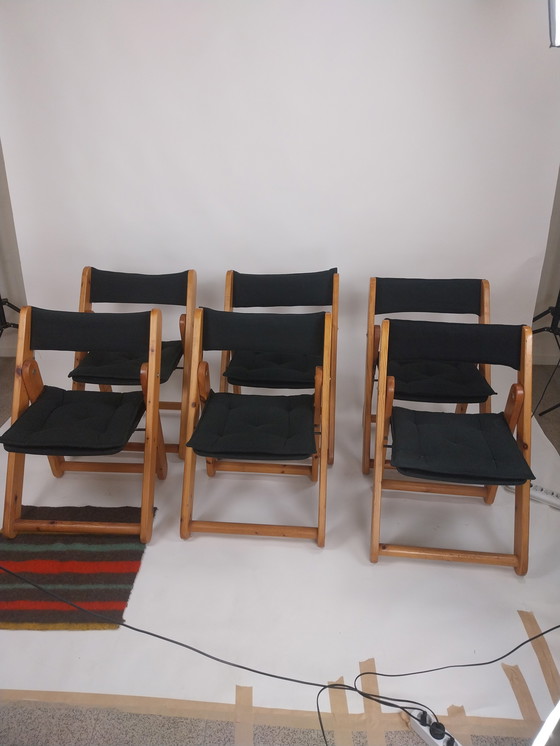 Questo set di 6 sedie pieghevoli vintage Ikea Kontiki degli anni '70 è una splendida aggiunta a qualsiasi interno. Le sedie hanno una robusta struttura in pino e comode sedute in tessuto nero. Sono facili da ripiegare e da riporre, ideali per avere un posto a sedere in più nelle occasioni speciali. Le sedie emanano un autentico fascino vintage e sono perfette per gli amanti del design retrò. 55 x 50 x 77 cm zh 45 cm