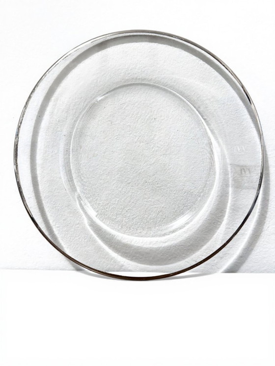 Set di 6 sottopiatti serie Aria di IVV (Industria Vetraria Valdarnese) filo platino con un diametro di 32 cm. IVV, fondata nel 1952 a San Giovanni Valdarno, ha sempre unito lavorazione artigianale del vetro e ricerca estetica. La linea Aria nasce alla fine degli anni '90 per offrire oggetti dal design essenziale e leggero, con trasparenze e riflessi.