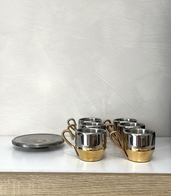 Set di 6 tazze e piattini in acciaio inossidabile placcati in argento e oro, realizzati in Italia negli anni '70