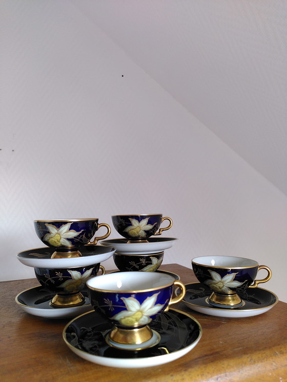 Set di 6 tazze e piattini in porcellana pregiata blu cobalto con doratura. Firmati in verde cromo / corona / Rosenthal / Bavaria / Johann Haviland. Ottime condizioni. Nessuna sbeccatura. Altezza tazza: 4,5 cm, diametro piattino: 11 cm.