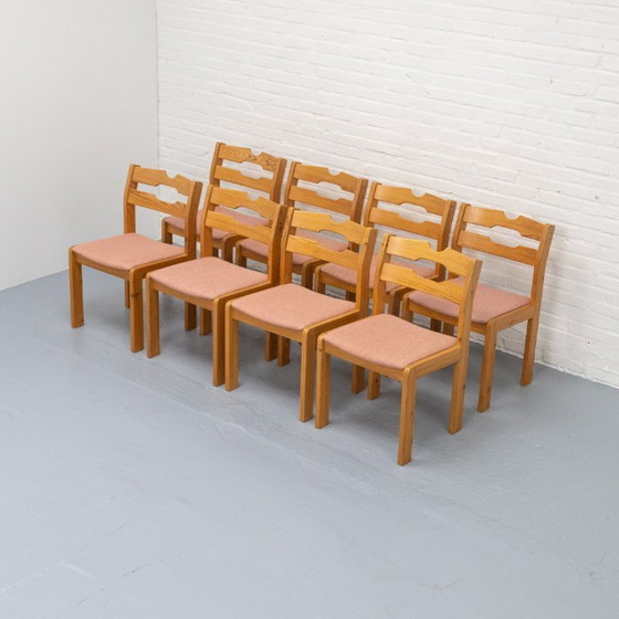 Un set di otto sedie danesi degli anni '60, prodotte da Korup Stolefabrik. Realizzate in pino con un elegante design a lama di rasoio e sedute rivestite in tessuto di lana rosa. Una combinazione luminosa e leggera con un look tipicamente scandinavo. In ottime condizioni vintage.