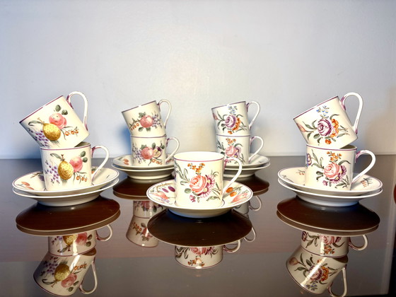 Tazze e piattini sono decorati con rose delicatamente dipinte a mano e vivaci motivi di frutta, che mettono in mostra la raffinata maestria e l'eleganza decorativa dell'epoca. Questo set esemplifica lo stile sofisticato e la maestria artigianale che resero la porcellana Mennecy-Villeroy molto apprezzata dai collezionisti aristocratici.