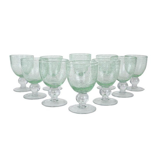 Set di 10 bicchieri in vetro verde con bolle e gambo sferico, pezzi vintage originali degli anni '60/'70. La caratteristica tecnica di incastonatura delle bolle d'aria conferisce loro un fascino unico e un valore da collezione. Ideali per servire vino, liquori o come elemento decorativo in composizioni in stile retrò.