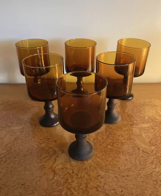 Set di sei bicchieri degli anni '60 in vetro color ambra con piedini in legno. Condizioni perfette. Da notare che 4 bicchieri hanno il legno leggermente verniciato e altri due sono più grezzi, ma questo non è sorprendente (la sfumatura è visibile nelle foto). Dimensioni: H16 x L8 x P8.