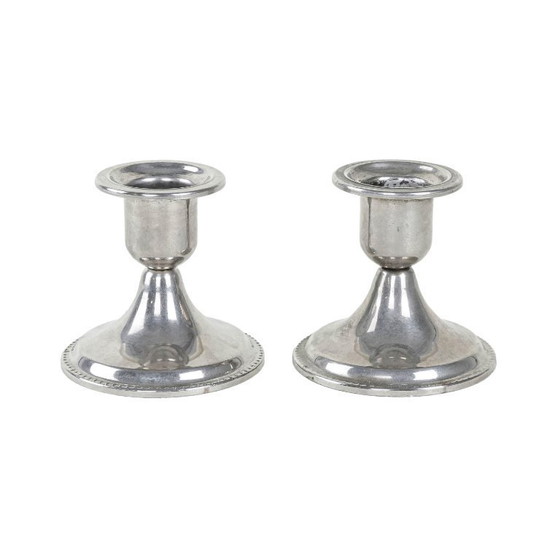 Una coppia di candelieri classici in metallo con finitura argentata. La loro forma semplice, con delicati dettagli lungo il bordo della base, conferisce loro un carattere elegante e senza tempo. Perfetti come complemento d'arredo per un tavolo o una toeletta.