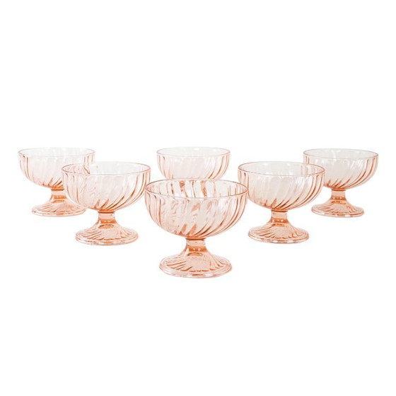 Sei ciotole da dessert in vetro di un delicato colore rosa. La superficie scanalata aggiunge fascino ed eleganza. Perfette per gelato, frutta o altri dessert.
