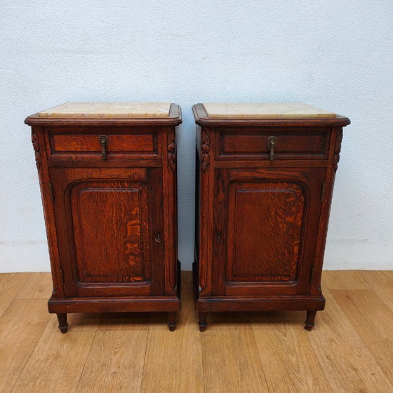 Questo set di comodini francesi d'epoca con piano in marmo beige/giallo è dotato di un'anta con serratura funzionante. Sono molto eleganti e perfetti anche come comodino da ingresso o da appoggio. Il precedente proprietario ha rivestito l'interno di questi mobili con plastica/carta.